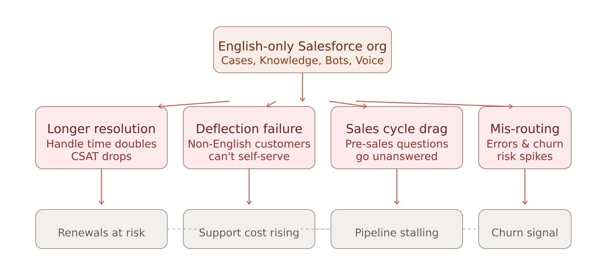 Now look at what most Salesforce orgs actually have. The Salesforce platform itself is beautifully localized, available in over 30 languages. But the workflows running inside it? English-only. Case comments, email-to-case templates, Knowledge articles, Service Cloud support. In most orgs, all of it is built and maintained exclusively in English. That gap between platform capability and organizational reality is where revenue disappears.