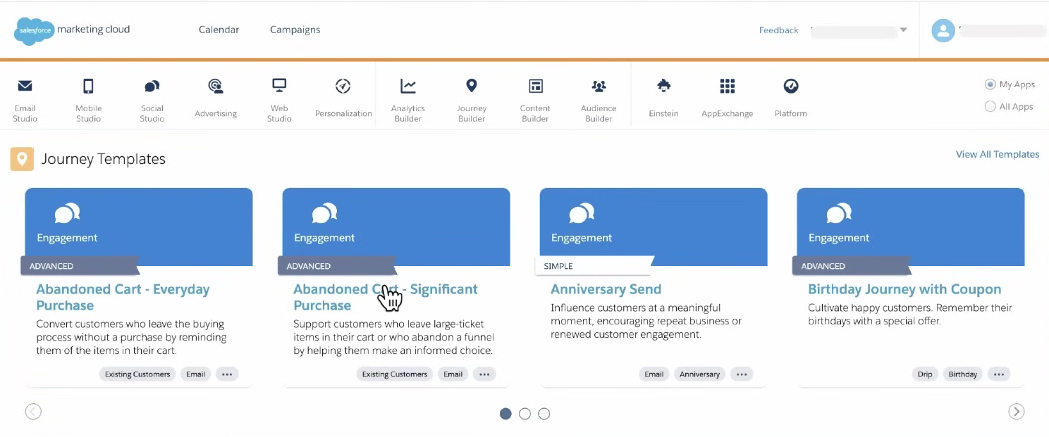| Journey Builder | Design automated, multi-channel customer journeys throughout the customer lifecycle. |