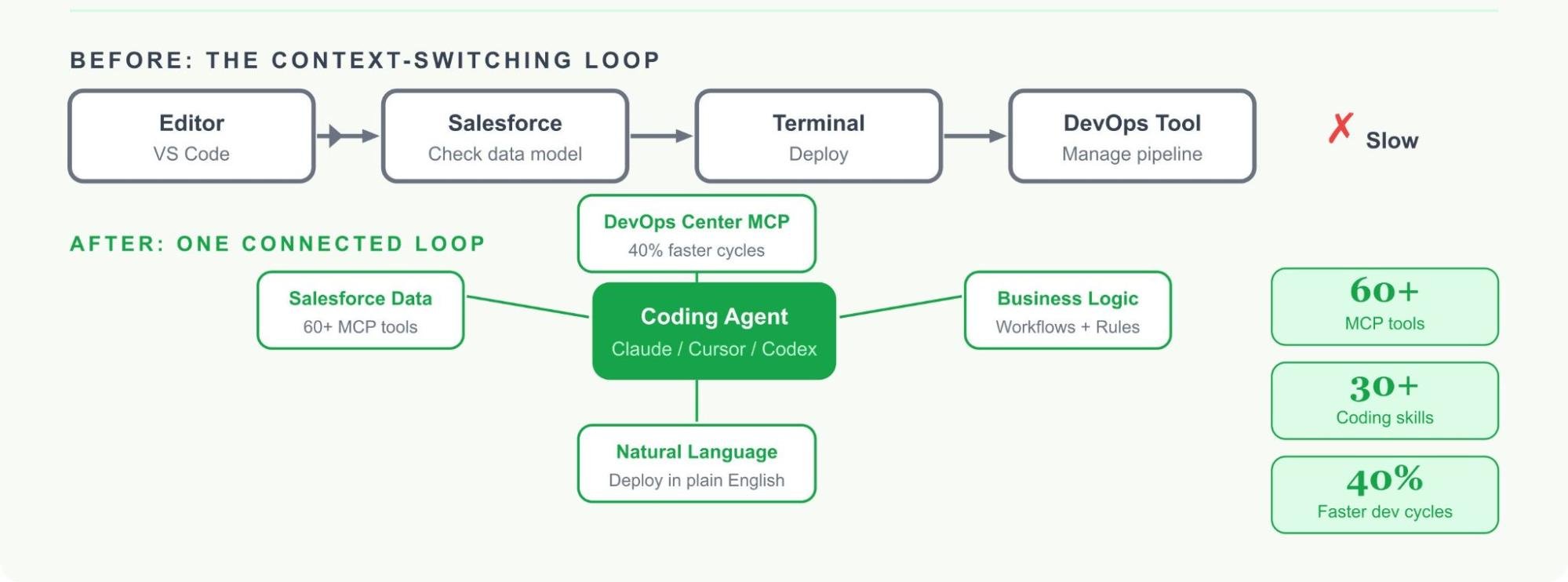 That's a big deal for AI-driven development. Traditionally, building on Salesforce meant context-switching constantly. You'd be in your editor, then jump into Salesforce to check a data model, then back to your terminal for deployment, then into a separate DevOps tool to manage the pipeline. Now, all of that happens inside one connected experience.