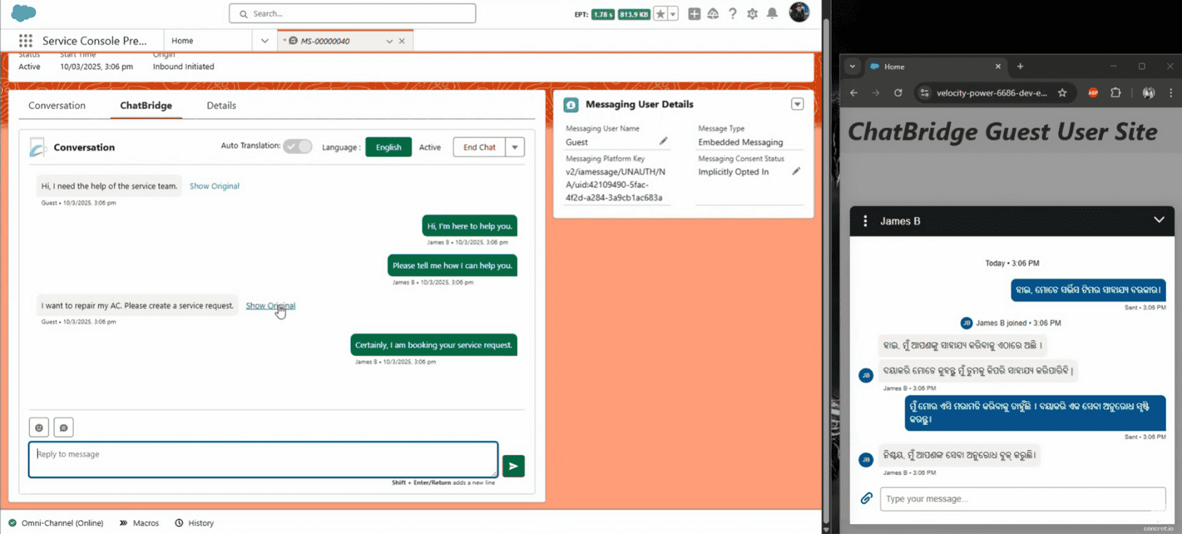 5. Unified Salesforce Interface: All translations take place directly within the Salesforce Service Console, so there’s no need to switch tabs or open external tools. Agents can chat, view translations, and respond to customers in one seamless interface, improving focus, speed, and overall productivity.
