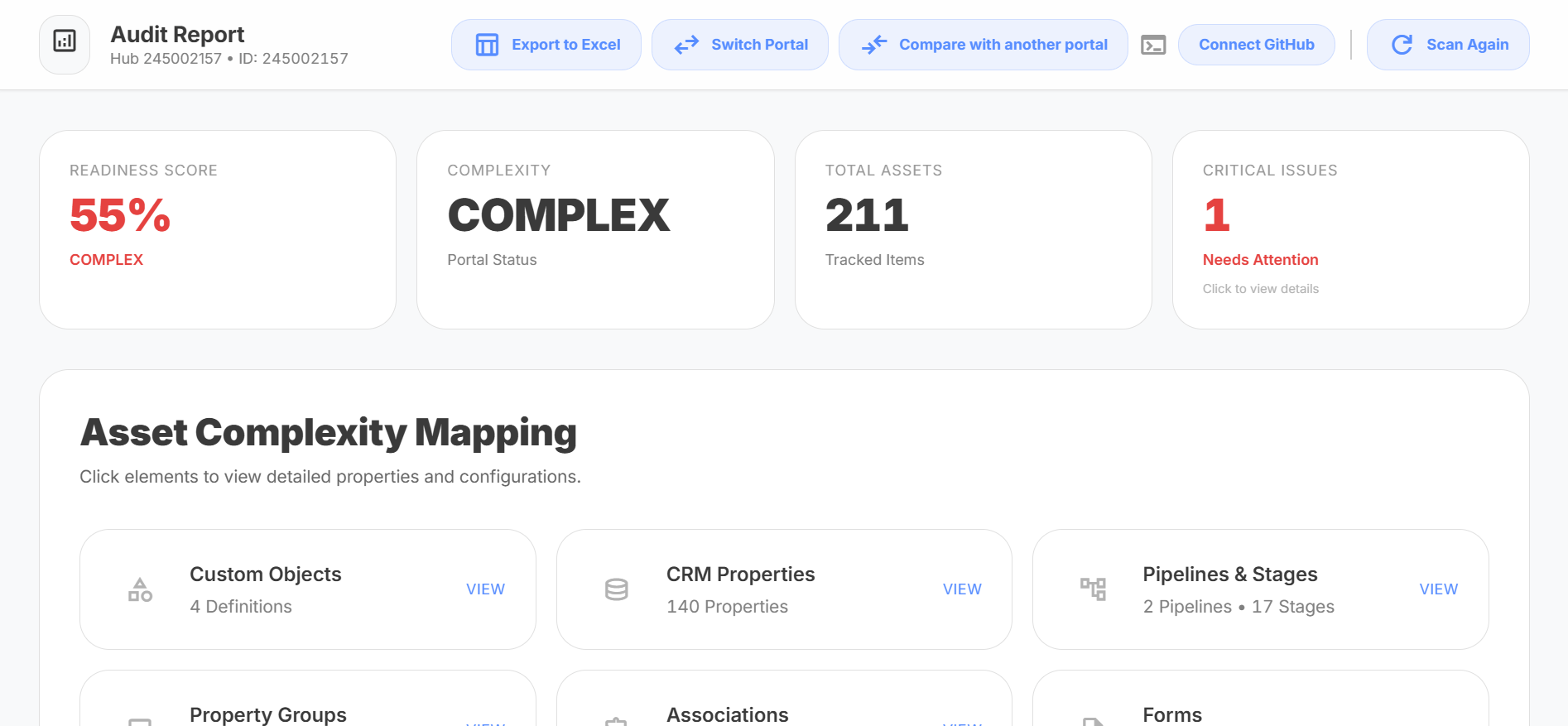 One scan: Full inventory + complexity score . Properties, pipelines, custom objects, workflows.